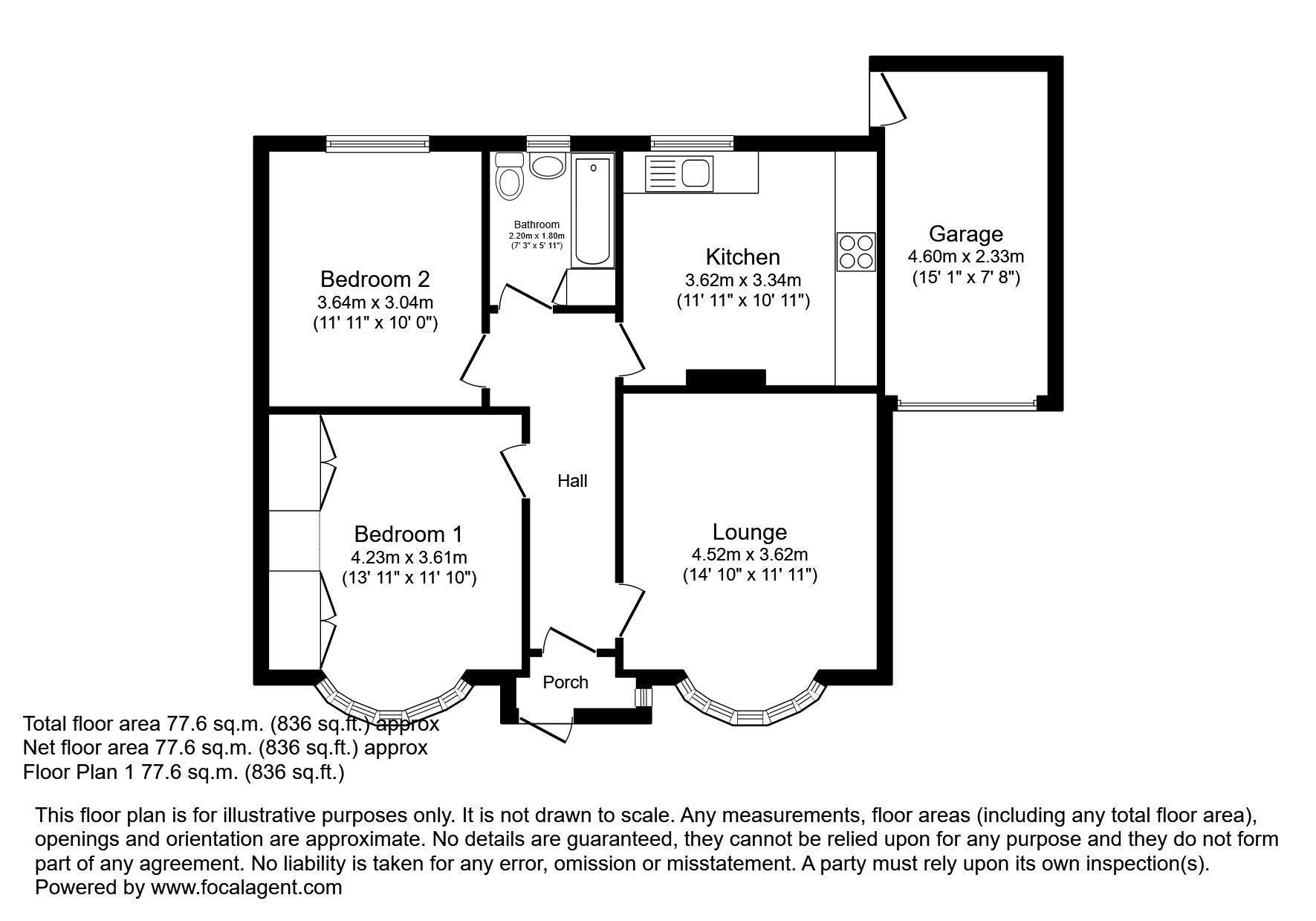 Entrance porch, hallway, living room, kitchen, bathroom, 2 bedrooms