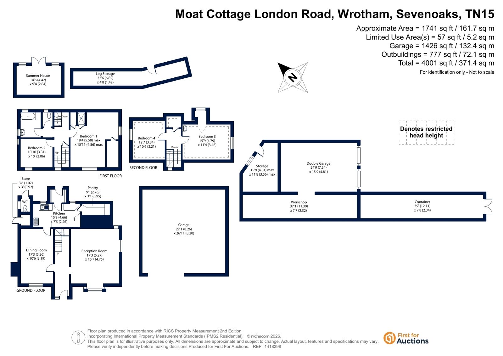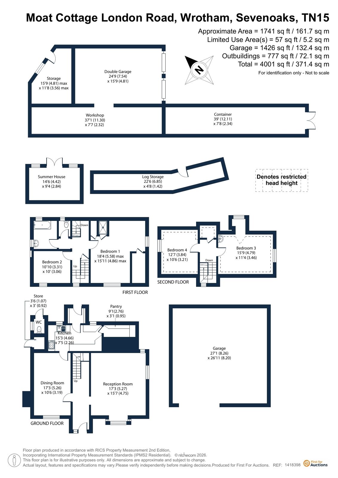 The accommodation extends to approximately 1,741 sq ft and comprises four bedrooms, reception room, dining room and kitchen arranged over three floors. The property also benefits from substantial outbuildings including a large garage, workshop and storage areas, providing further versatility and potential for a range of uses, subject to the necessary consents.