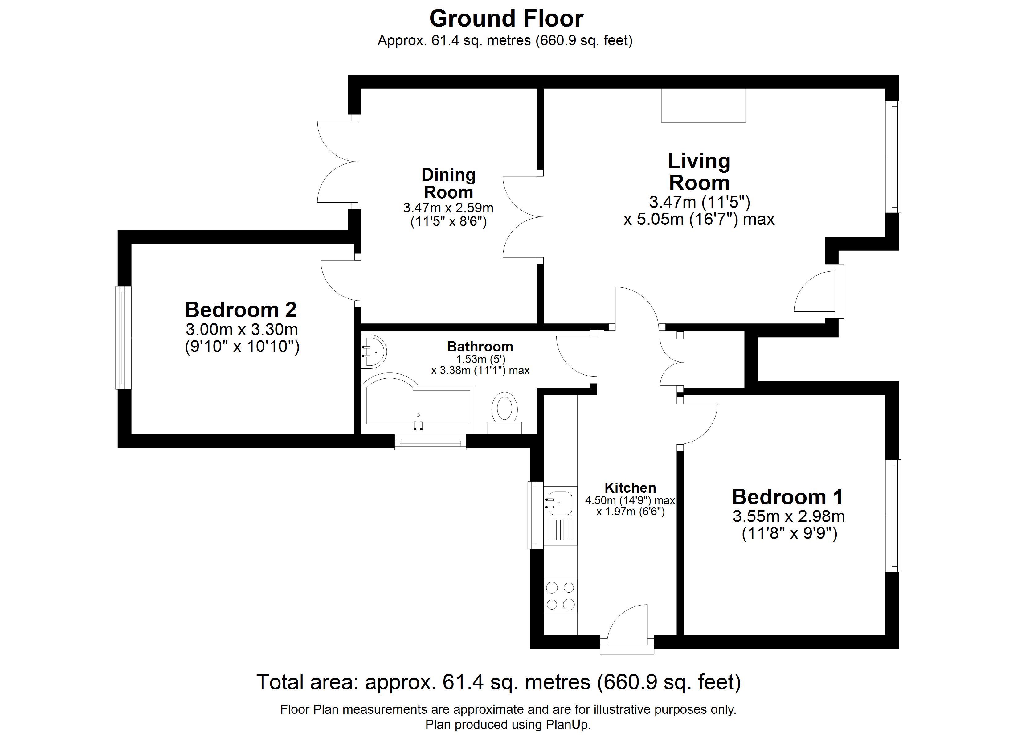Entrance hall, living room, dining room, kitchen, 2 bedrooms.