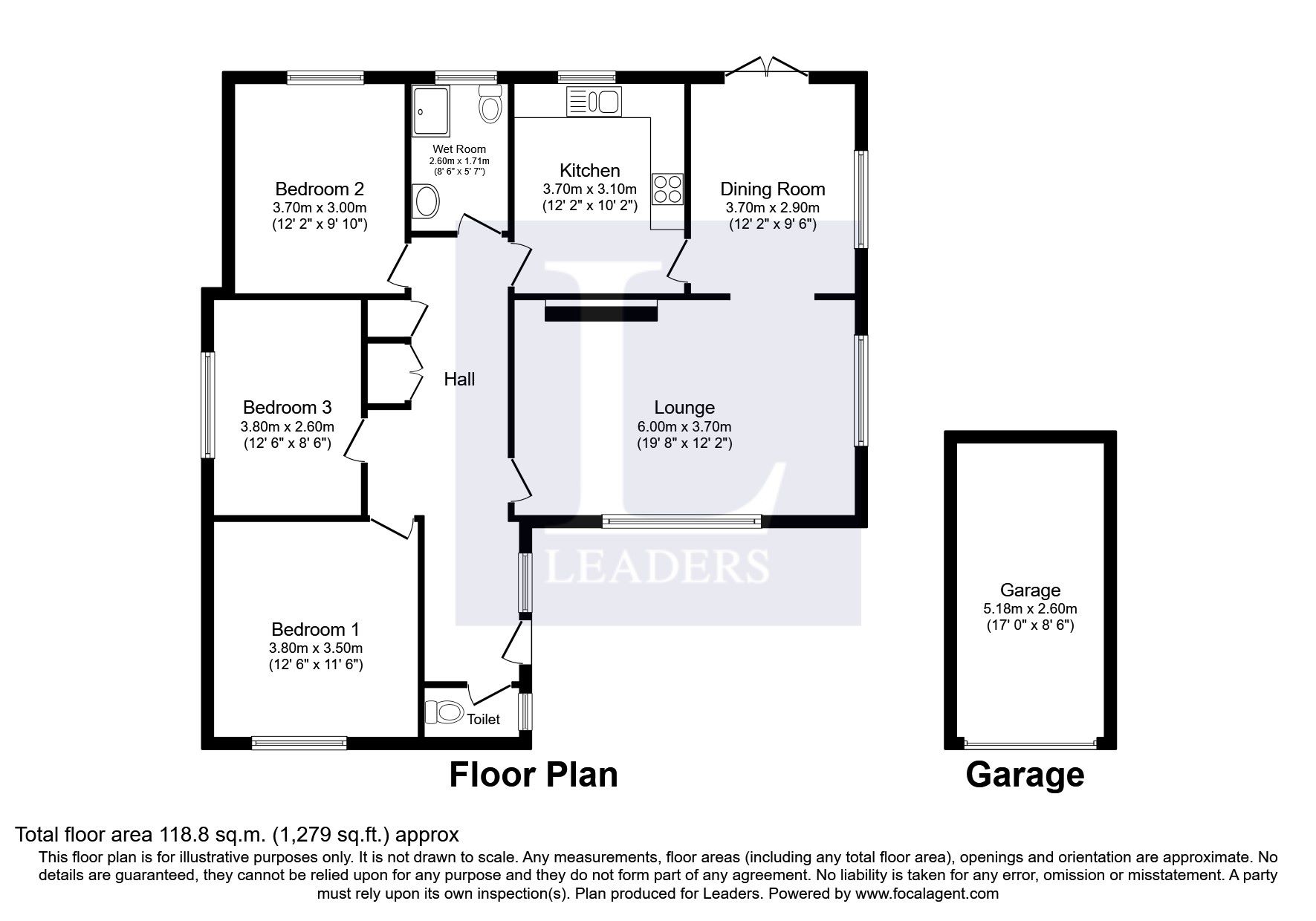 Entrance hall, living room, dining room, kitchen, 3 bedrooms, bathroom, WC