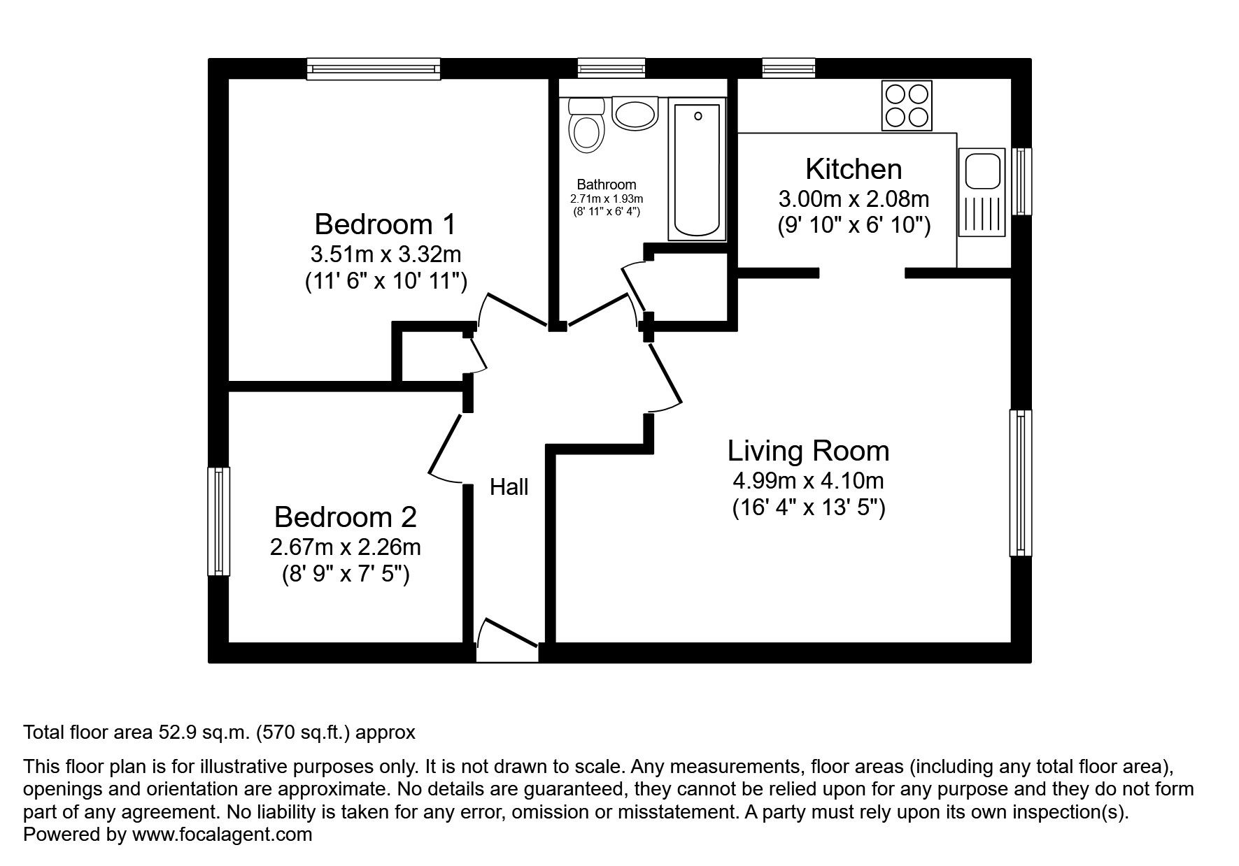 Entrance hall, living room, kitchen, 2 bedrooms, bathroom