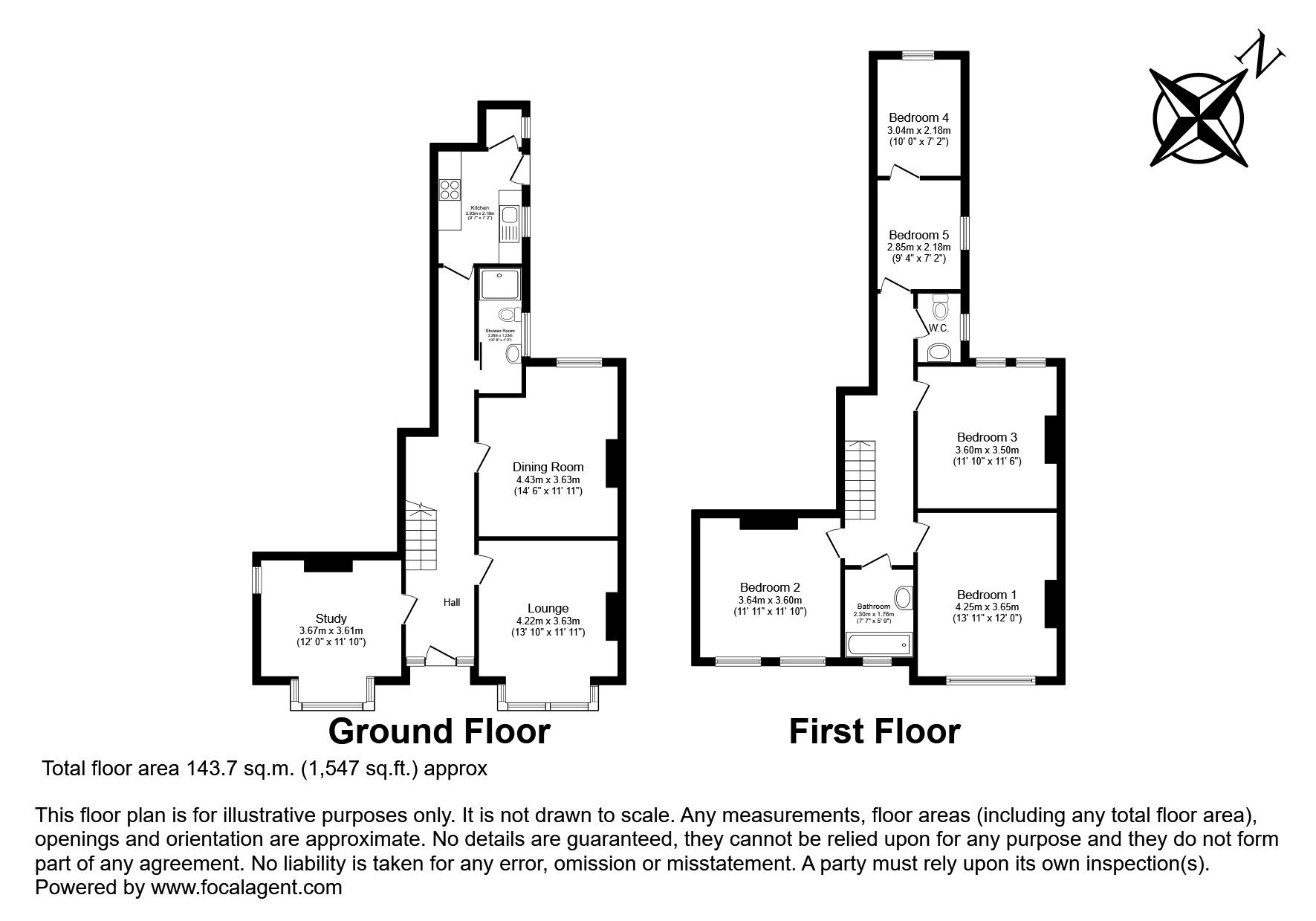 1st Floor: 5 bedrooms, bathroom, WC
