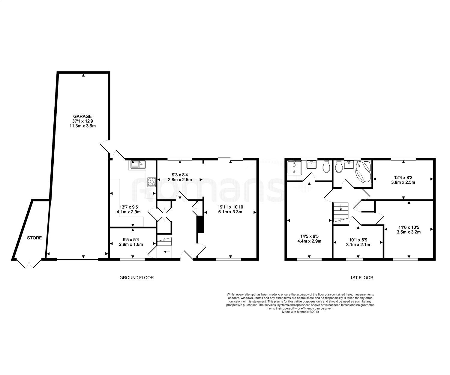 Front garden with driveway parking, double length garage with additional storage, rear garden