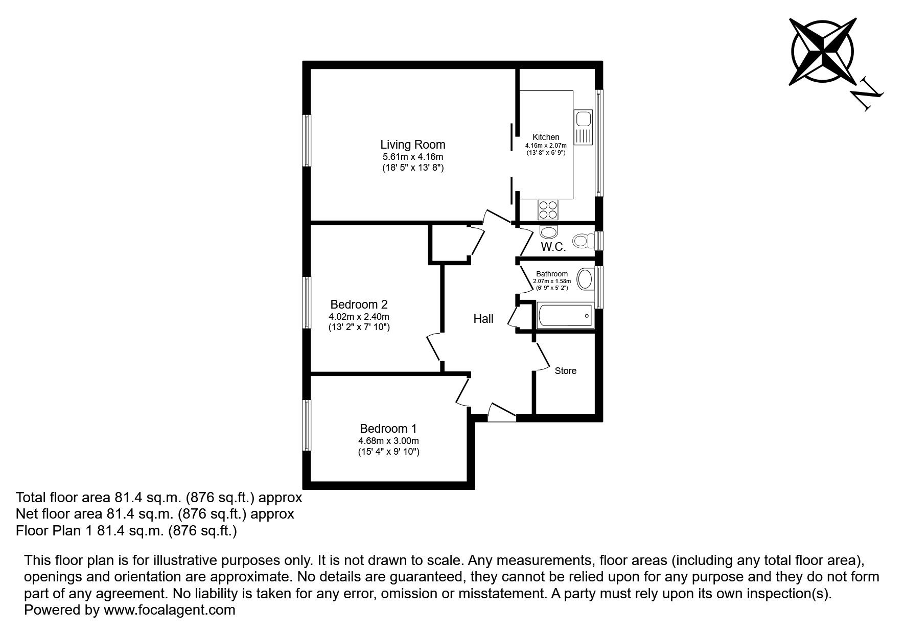 Entrance hall, living room, kitchen, 2 bedrooms, bathroom, WC and store room